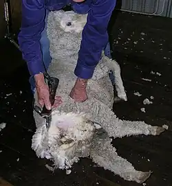 Ein Schafscherer schneidet mit elektrischen Hand-Schermaschinen den Winterpelz der Schafe ab. Ursprünglich wurde diese Arbeit mit Hand-Schafscheren ausgeführt. In einigen Ländern ist Schafscherer ein eigenständiger Beruf, der in besonderen Schulen wie beispielsweise in Queensland ausgebildet wird.[1] Der Beruf der Schafscherer entwickelte sich durch die Arbeitsteilung, die durch die massenhafte Produktion von Schaffleisch und Schafwolle hervorgerufen wurde. Die Wurzeln dieses Berufes liegen in Australien, wo um 1800 die Schafzucht mit dem Schafzuchtpionier John Macarthur begann und die sich anschließend zur Massenproduktion entwickelte. Heute gibt es diesen Beruf vor allem in Australien und Neuseeland, in Deutschland ist er selten und wird als Nebenerwerbsberuf ausgeübt.