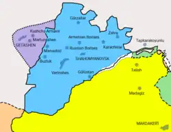 1750 wurden die fünf Meliktümer durch das Khanat Karabach unterworfen. Auch der ehemalige Fürstensitz Zar wurde zerstört und in den folgenden Jahrzehnten von turksprachigen und kurdischen Siedlern in Besitz genommen.[4] Um Gjolistan und Nerkinschen blieb jedoch die armenische Besiedlung. 1813 kam das Gebiet durch den genau hier unterzeichneten Vertrag von Gulistan an Russland.[6][7][8] Nach der Oktoberrevolution und der Unabhängigkeitserklärung der Staaten südlich des Kaukasus war die Region zwischen der Republik Armenien und der Republik Aserbaidschan umstritten und umkämpft. Nach Eingliederung beider Staaten in die Sowjetunion fiel das Gebiet an die Aserbaidschanische SSR. Zu Sowjetzeiten wurde in den fast vollständig armenischsprachigen Gebieten um Nerkinschen und Gjolistan nördlich der armenisch-besiedelten Autonomen Oblast Bergkarabach der Rajon Schahumjan gebildet, der jedoch nicht der Autonomen Oblast zugeordnet wurde. Die Hauptstadt Nerkischen[9] oder Nerkinschen[10] (Nerkin Schen, Неркин Шен bzw. Ներքին Շեն, „unterer“ oder „innerer Weiler“) wurde 1938 zu Ehren von Stepan Schahumjan in Schaumjanowsk (russisch Шаумя́новск) oder Schahumjan (armenisch Շահումյան) umbenannt. Weitere wichtige Orte waren Getaschen, Martunaschen und Gjolistan, wobei Getaschen zum Nachbarrajon Xanlar gehörte.