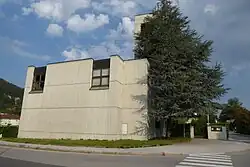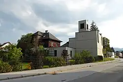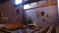 Die Kirche ist ein schmuckloser kubischer Bau mit hohem Kirchturm und quadratischem Grundriss. An der Chorwand ist ein Kruzifix des Bildhauers Jakob Adlhart angebracht.[2]