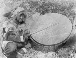 Die Naukan-Schamanen am nordöstlichsten Zipfel Sibiriens schlugen früher ihre Rahmentrommeln mit dem Schlägel auf den Rahmen. Der Handgriff bestand aus dem Stoßzahn eines Walrosses oder einem Rentiergeweih. Als Membran wurde die dünne und fast durchsichtige Magenhaut des Walrosses verwendet.[33] Eskimo-Trommeln waren selten und wenn, dann nur mit unbedeutenden Zeichen bemalt. Einzige Ausnahme sind die Chugachmiut-Schamanen im südlichen Alaska (Chugach Mountains), die alle Trommelfelle verzierten, während sie teilweise in den Ritualen die Trommeln gegen Rasseln austauschten.