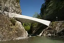 Die Brücke ist das Ergebnis der Ausreizung der Bogenform mit Hilfe moderner Technologien. Der Bogen ist auf ein statisches Minimum reduziert und gleichzeitig in sich verwunden. Dadurch passt sie sich an die Krümmungen der bestehenden Straße an. Besonders imposant wirkt sie vom Ufer der sich durch die Klamm windenden Dornbirner Ache.