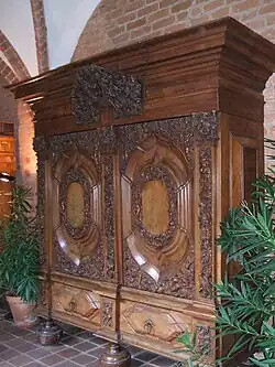 Als Hörnschapp wird ein Eckschrank, dessen zwei Seiten oft reich mit Schnitzwerk geschmückt ist, bezeichnet. Er ist im 17. Jahrhunderttypisch für Dithmarschen.[4][5]