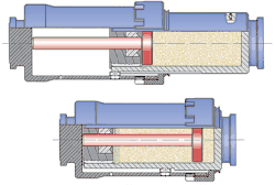 Der TwinStroke dämpft Zug- und Druckkräfte ohne ein weiteres Funktionselement. Ein Kolbensystem überträgt die Zug- und Druckkräfte auf gashydraulischer Basis in verschiedene Gas- und Ölkammern. So kann nahezu jede Belastung unverzüglich und verschleißarm aufgenommen werden. Von Vorteil sind die geringe Baugröße und das niedrige Gewicht, da man nur noch ein Element zur Aufnahme von Druck- und Zugkräften braucht. Er ist zudem preisgünstiger als ein vergleichbares System mit zwei Elementen und ist bei Bedarf schnell auszutauschen. Der TwinStroke kann auch sehr gut wechselnde Belastungen aufnehmen.