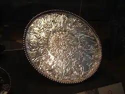 Vier größere Schüsseln mit umgelegtem breitem Rand gehören nach der Form zusammen. Der Boden einer Schüssel ist mit Darstellung einer Bärenjagd versehen. Die Mittelmedaillons der anderen Schüsseln zeigen einmal einen behelmten männlichen Kopf und bei den übrigen beiden Exemplaren eine Frauenbüste mit offenen bzw. verhüllten Haaren. Die Ränder sind jeweils mit Tierfriesen und Büsten verziert. Ein weiterer Satz umfasst vier kleinere tiefe Schüsseln, deren Rand mit vegetabilen Mustern verziert ist.
