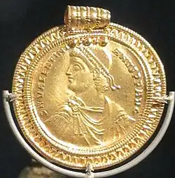 Die vier römischen Münzen zeigen die Kaiser Konstantin I. (306–337, X5), Constans (337–350, X6), Valentinian I. (364–375, X15) und Gratian (375–384, X2). Besonders der Solidus des Constans ist stark abgegriffen, was für eine längere Nutzung der Münzen vor der Umarbeitung zu einem Medaillon spricht. Die Münzen von Konstantin, Constans und Gratian wurden in Trier geprägt, die des Valentinian in Thessaloniki. Alle vier Münzen wurden mit einem Schmuckrand eingefasst und mit Ösen versehen, um sie als Kettenanhänger tragen zu können. Eine Verwendung römischer Münzen als Anhänger ist auch aus anderen Funden bekannt wie etwa aus dem Schatzfund von Brangstrup mit insgesamt 48 römischen Goldmünzen, von denen mehrere durchbohrt worden waren und vermutlich als Halsschmuck dienten.[12] Das Besondere an dem Schatz von Vindelev ist, dass erstmals in Skandinavien gleich mehrere kunstvoll zu einem Anhänger umgearbeitete römische Münzen enthalten waren. Zudem handelt es sich um den ersten Fund, bei dem zu Anhängern umgearbeitete römische Goldmünzen und Brakteaten am selben Ort gefunden wurden.[13]