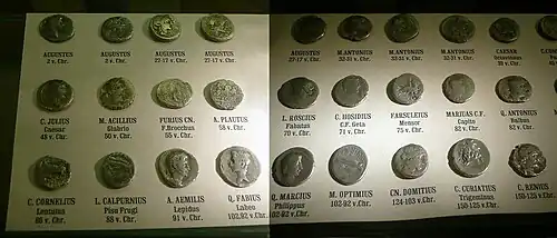 Von den Münzen stammten 21 aus der Zeit der römischen Republik und weitere aus der frühen römischen Kaiserzeit. Darunter waren drei Legionsdenare von Marcus Antonius und sechs Denare von Kaiser Augustus. Vier der Augustus-Münzen waren Fälschungen durch einen Kupferkern, der mit Silber ummantelt war. Die älteste Münze wurde 145 v. Chr. geprägt; die Schlussmünze ist ein Gaius-Lucius-Denar, der 2 v. Chr. bis 1 v. Chr. geprägt wurde. Die Münzen waren stark abgenutzt, was auf eine lange Umlaufzeit schließen lässt.