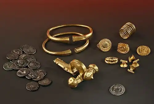 Unter dem zweiten Stein lagen etwa 10 Goldmünzen aus der Zeit Konstantins und seiner Söhne zusammen mit Goldschmuck unter künstlich zusammen gehäuften kleinen Steinen. Die einzige erhaltene Münze stammt aus dem Jahr 327. Im Einzelnen bestand der Goldschmuck aus:
