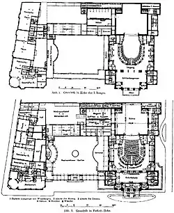 Im I. Stock befand sich über der Eingangshalle ein Foyer für die Besucher des Parketts und des I. Ranges. Die Besucher des II. und II. Ranges konnten das Treiben von den offenen Galerie aus beobachten, die gleichzeitig als Zugang zu den Rängen wie als Aufenthaltsräume während der Pausen dienten. Im Sommer konnte man vom Parkettumgang aus zudem auf die Terrasse treten, vom Umgang des I. Ranges aus auf einen 25 Meter breiten und 5 Meter tiefen Balkon.