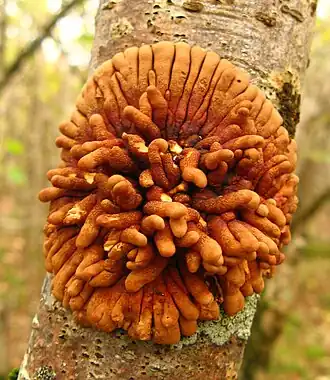 Hypocreopsis rhododendri an einem Hasel-Stamm