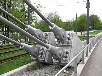 Die Brücke hat zwei getrennte, leicht nach oben gewölbte Brückendecks, die beide an einem schrägstehenden, ca. 34 m hohen Masten hängen. Die Straßenbahnbrücke mit zwei Gleisen und beiderseitigen schmalen Dienstwegen verläuft im Grundriss gerade unter dem geneigten Mast, die Radfahrer- und Fußgängerbrücke beschreibt einen leichten Bogen um die andere Seite des Mastes. Beide Brücken sind nur durch drei Querträger miteinander verbunden. Auf beiden Seiten der Straßenbahnbrücke sind diese Querträger mit sechs schrägen, 10 cm starken Seilen am Mastkopf angehängt. Die Fußgängerbrücke lagert außerhalb der Schrägseile auf den Querträgern. Der Mast ist mit vier Seilen nach Süden neben den Straßenbahngleisen rückverankert sowie mit zwei Seilen nach Westen neben der Einhausung.