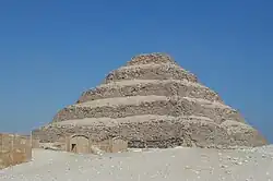 Der Übergang von der Mastaba als Begräbnisstätte der Könige der ersten und zweiten Dynastie hin zur Form der Pyramide fand unter Djoser statt: Ausgehend von einer Mastaba aus kleinformatigen Steinen, die mehrfach erweitert wurde, entstand durch Anfügen mehrerer, nach innen mit einem Winkel von 72°[1] geneigter Schichten mit einer Dicke von jeweils 5 Ellen, deren Höhe von außen nach innen zunahm, die erste Pyramide (Djoser-Pyramide). Äußerlich sind die unterschiedlichen Höhen der Schichten als Stufen zu erkennen, was in der Literatur oft zu der fälschlichen Bezeichnung „Stufenpyramide“ geführt hat.