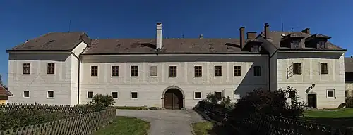 Der Gutshof ist eine an drei Seiten geschlossene Anlage mit zwei Geschoßen unter einem Walmdach. Bei den heutigen Eckrisaliten handelt es sich um ehemalige Ecktürme. Am ostseitigen Trakt des Bauwerks befindet sich ein spätbarocker viergeschoßiger Glockenturm mit flachbogigen Schallfenstern und einem Pyramidenhelm aus der zweiten Hälfte des 18. Jahrhunderts.[4]