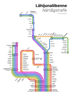Es gibt vier Eisenbahnstrecken, auf denen insgesamt 15 verschiedene Linien verkehren. Alle Strecken beginnen am Hauptbahnhof Helsinki und verzweigen sich nach dem ersten gemeinsamen Bahnhof Pasila in folgende Richtungen:
