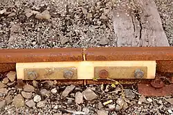 Alte Bauform eines isolierten Stosses der Matterhorn-Gotthard-Bahn im Bahnhof Göschenen (2019)