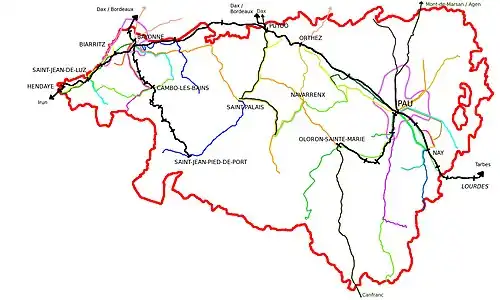 - Die Compagnie du Chemin de fer Pau–Oloron–Mauléon et du Tramway de Bayonne à Biarritz (POM) übernahm 1898 den 1888 von der Compagnie des Tramways de Bayonne au Lycée et à Biarritz (BLB) eröffneten Bahnbetrieb und elektrifizierte die Strecke. Außerdem besaß die POM im Zentrum und im Osten des Departements mehrere Lokalbahnen, die mit Dampf- und Dieselfahrzeugen bedient wurden.