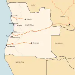 Der Schienenverkehr in Angola ist auf die Häfen Angolas ausgerichtet. Er wird auf drei Netzen durchgeführt, die nicht verbunden sind. Eine weitere nicht mit den drei Netzen verbundene Strecke wurde inzwischen eingestellt. Es finden sowohl Güter- als auch Personenverkehr statt. Im Jahr 2010 betrug die gesamte Streckenlänge 2764 Kilometer, davon 2641 Kilometer in der im südlichen Afrika üblichen Kapspur und 123 Kilometer in der 600-Millimeter-Spur (Stand 2010).[1] Alleiniger Betreiber ist die staatliche Gesellschaft Caminhos de Ferro de Angola (CFA). 2015 wurde die Benguelabahn wiedereröffnet.