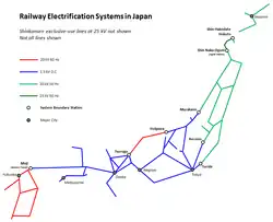 - 20 kV 60 Hz Wechselspannung: Haupt- und Nebenstrecken von JR Kyushu, vereinzelte Privatbahnen im Westen Japans;