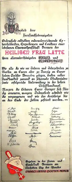 Nach dem erfolgreichen Studium begannen viele Schiffbauingenieure der Latte ihren Berufsweg in den Küstenstädten bei Werften, Reedereien, Zulieferfirmen und Klassifikationsgesellschaften. Hier haben sie sich oft schon als Praktikanten zu Gruppen zusammen gefunden, um die von den Schiffbauersälen gewohnte und beliebte Gemeinschaft auf den Werften, in Stammtischen von Kneipen oder Gaststätten zu pflegen. Denn wer die Gemeinschaft der Latte genossen hatte, mochte sie nicht mehr missen. Je nach Engagement und Größe der Gemeinschaft entstanden Ableger der Heiligen Frau Latte als Ritterschaften, Grafschaften, Mark- oder Churmarkgrafschaften. So wird in den Ordenszeitungen und der Chronik der Latte zu Hannover ad Hammaburg[7] auch von der „Markgrafschaft Hamburg“ berichtet, die 1907 vom Komtur von Zydowitz gegründet wurde. Der Höhepunkt all dieser „Latte-Ableger“ war die Teilnahme am jährlichen Ordensfest in Berlin. Hier wurden die mit kunstvollen Papporden geschmückten Abordnungen aus der Provinz feierlich begrüßt und deren häufig doppelsinnige Geschenke gerne und mit viel Spaß und Ulk entgegengenommen.