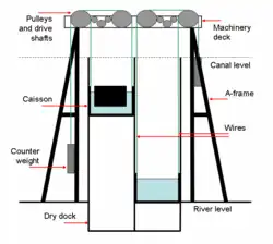 Der Oberbau bestand aus sieben hohlen, gusseisernen Pfeilern, an denen Führungsschienen für die Tröge angebracht waren, einer Arbeitsplattform sowie Treppen und Laufwegen für das Betriebspersonal. Unten auf Flussniveau wurden die Tröge direkt ins Wasser des Hafenbeckens abgesenkt, so dass hier keine Tore nötig waren. Am oberen Ende stellte eine 50 Meter lange, schmiedeeiserne Kanalbrücke die Verbindung zum Trent and Mersey Canal her.