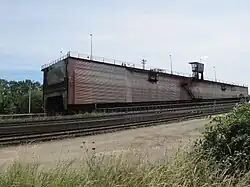Blick auf die Gleise des östlichen Trogs beiderseits der Rinne und des Gegengewichts am Boden der Rinne -