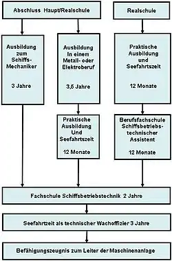 Die Qualifizierung entspricht der internationalen Schiffsbesatzungsverordnung STCW. Die Ansprüche für den Erwerb der Befähigungszeugnisse, auch Patente genannt, regeln sich nach der im Schiff installierten Maschinenleistung, dem voraussichtlichen Fahrtgebiet und der angestrebten Stellung an Bord. Im technischen Zweig wird zwischen zwei Patentstufen unterschieden: zum einen dem „Befähigungszeugnis für den technischen Dienst auf Schiffen mit allen Antriebsleistungen“ und zum anderen dem „Befähigungszeugnis für Schiffsmaschinisten“.