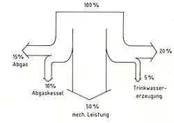 Wichtig ist außerdem auf den heutigen Schiffen ein vollautomatischer wirtschaftlicher Betrieb, eine hohe Zuverlässigkeit und eine einfache Bedienbarkeit. Die mit dem Brennstoff zugeführte Energie von Schiffsdieselmotoren wird zu 40 – 50 % in mechanische Energie umgewandelt, es verbleiben ca. 50 – 60 %. Von diesen Verlusten werden etwa jeweils die Hälfte durch die Kühlmedien und mit dem Abgas abgeführt. Diese Energiebilanz wird graphisch dargestellt als Sankey-Diagramm bezeichnet. Die Daten der Wärmequellen liegen relativ frühzeitig fest, mit der Festlegung der Antriebsleistung und des Hauptmotortyps sind vom Hauptmotorhersteller spezifische Angaben verfügbar. Mit der E-Bilanz, Auswahl der Hilfsdieselgeneratoraggregate und Hilfsmaschinen sind die weiteren Abwärmequellen vorgegeben und können überschlägig bestimmt werden.