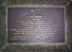 Flinders kam dem Versprechen, seinem Schiffskater und Freund Trim ein Epitaph zu errichten, nicht mehr nach, aber 1996 wurde von John Cornwell eine Trim-Bronzeplastik angefertigt, die bei der Mitchel Library in Sydney steht; auch das Café der Bibliothek wurde nach Trim benannt. Zusätzlich befindet sich eine Statue von Flinders zusammen mit Trim in Flinders Geburtsstadt Donington (Lincolnshire) und eine lebensgroße Bronzeplastik, die Flinders bei der Vermessung zusammen mit Trim zeigt, wurde am 19. Juli 2014 von Prince William im Australia House in London enthüllt. Die Plastik steht heute in der Euston Station in North London, der Gegend, in der man Flinders Grab vermutet.[52] Eine weitere Statue wurde 2017 vom südaustralischen Gouverneur Hieu Van Le in Port Lincoln enthüllt.[53]