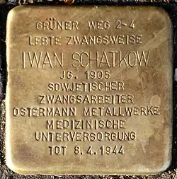 Ein Stolperstein erinnert daran, dass bei Ostermann während des Zweiten Weltkriegs Zwangsarbeiter eingesetzt wurden