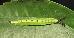 Die schneckenförmigen Raupen haben meist zwei in der Ruhe nach vorn gerichtete, beim Fressen nach oben gestellte, Kopfhörner (daher der Name Schneckenraupen). Wie die Charaxinae haben sie ein gegabeltes Hinterleibsende.[2]