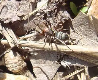 - ↑ Christian O. Dietrich, Thilo Busch: Arboricaria sociabilis (KULCZYNSKI, 1897) (Araneae: Gnaphosidae) neu für Österreich: Ein spezialisierter, myrmekoider Räuber von Liometopum microcephalum (PANZER, 1798) (Hymenoptera: Formicidae)? In: Wissenschaftliche Mitteilungen Niederösterreichisches Landesmuseum. Band 16, Nr. 1, 2004, S. 40–41 ([2] [PDF; abgerufen am 15. Februar 2020]).
