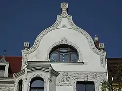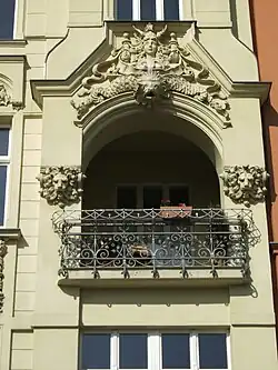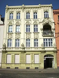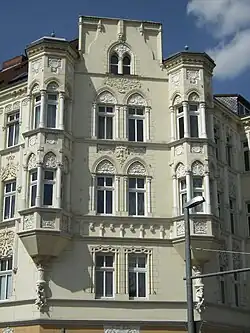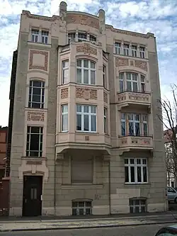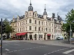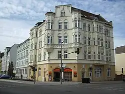 Fassade des Mietwohn- und Geschäftshauses. 1901/02 (BE), Bauherr war der Maurermeister August Patzelt, dessen Architektur- und Baubüro die Ausführung übernahm. Anfang der 1990er Jahre erfolgte die Entkernung des Inneren und die Erneuerung der Fenster. Das Eckgebäude mit reichem, ursprünglich polychrom gefasstem Fassadendekor. Die abgeschrägte, durch einen Blendgiebel erhöhte Ecke wird von zwei Polygonalerkern flankiert, die auf Konsolen in Form von Fabelwesen aufsitzen. Die Seitenflächen sind durch rechteckige Erker untergliedert. Im Erdgeschoss befinden sich ein Ladengeschäft und die Eingänge. Die Geschosse sind durch Gesimse voneinander abgesetzt. Schlanke hochrechteckige Fensterformate mit aufwendiger, geschossweise variierender Stuckrahmung, teils durch Konsolköpfen liegende Dienste gerahmt. Im Dekor zeigen sich neugotische Motive, wie Spitzbögen, Ast- und Blattwerk, in ihrer Stilisierung aber unter Einfluss des Jugendstils. Charakteristisch für diese Stilrichtung sind auch die Ambivalenz der Formen, die als Ornament, aber auch als figürliche Motive zu lesen sind. Ungewöhnlich nicht nur in der Motivwahl, sondern auch im Reichtum des Dekors, der in Teilen eine manuelle Ausmodellierung erkennen lässt. In der phantasievollen, ganz individuellen Fassadengestaltung ist es ein herausragendes Beispiel früher vom Jugendstil beeinflussten Gestaltung.