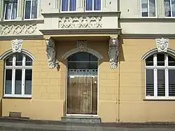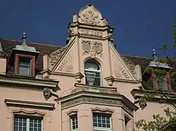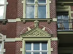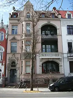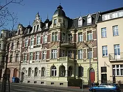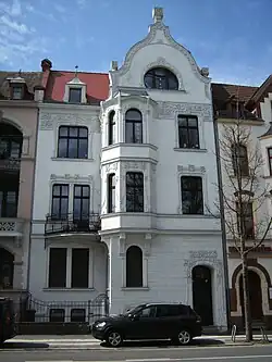 Mietwohnhaus. 1897 (BE), Ersteigentümer war der Tuchfabrikant Felix Hirschmann, die Ausführung erfolgte durch den Maurermeisters Paul Broeske. Urheber der als Bildhauerarbeit in Rechnung gestellten Dekorelemente war der Stuckateur Walter Adler. 1994–96 erfolgte eine vorbildliche Restaurierung. Die Fassade ist mit feiner Quaderritzung durch zwei Seitenrisalite asymmetrisch untergliedert. Beide Risalite mit Zwerchgiebeln abschließend. Diese sind durch Polygonalsäulen mit Kugelaufsätzen untergliedert. Auf den Kugeln befinden sich schmiedeeiserne Aufsätze, die sich in den Dachhäuschen mit Zeltdach fortsetzen. Die hochrechteckigen Fenster mit einer in die Wandfläche eingelegten Rahmung aus Stab- und Blattwerk. Über dem Eingangsportal befindet sich eine Inschrift mit den Worten „Eigener Herd ist Goldes Wert“. Der Vorgarten ist mit einem bauzeitlichen Lanzettenzaun umgrenzt. Im Inneren befindet sich ein gehobenes Ausstattungsniveau mit Stuckdecken und reich dekorierten Supraporten. Späthistoristische Architektur, mit dem in Ansätzen neugotischen Bauschmuck in filigraner Ausformung aktuellen Gestaltungstendenzen folgend. Von Bedeutung auch im Inneren durch qualitätsvoller, bauzeitlicher Substanz geprägte Architektur mit hohem Wohnstandard.