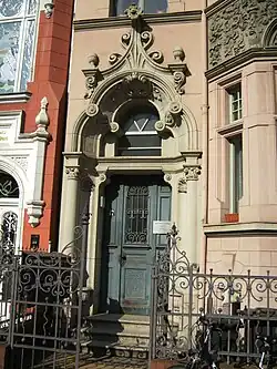 Mietwohnhaus. 1897/98 (BE/i) für die Architekten und Maurermeister Dümpert & Hauke errichtet, deren Baugeschäft die Ausführung übernahm. Das Gebäude mit bauzeitlicher Vorgartenfriedung ist im Kontext der Blockrandbebauung. Die Fassade ist asymmetrisch untergliedert: links Eingangsachse mit aufwendig gestaltetem Portal. Mittig trapezoider Vorbau mit reich dekoriertem Zwerchgiebelabschluss, daran befinden die Initialen der Bauherren und das Baudatum in Stuck. Rechts markante, Geschossübergreifende Loggia mit dekorativen Brüstungen in Stein und Eisen. Das Dekor ist von ganz unterschiedlichen Stilrichtungen beeinflusst. Die Kiel- und Vorhangböden sowie fialen- und krabbenähnlichen Strukturen sind an gotischen Formen orientiert. Elemente wie Zahnschnitt, Pilaster und Dreiecksverdachungen sind dagegen dem klassizistischen Formenkanon zuzuordnen. In der eigenwilligen Kombination und Stilisierung der Formen sind bereits aktuelle, vom Jugendstil ausgehende Gestaltungsansätze aufgenommen. Unter dem Einfluss dieser Stilrichtung ist auch das schlichte, noch weitgehend bauzeitlich geprägte Innere. Das Gebäude ist von Bedeutung als qualitätsvolles Beispiel der Übergangsphase zwischen Späthistorismus und Jugendstil. Dieser fließende, innerhalb nur weniger Jahre stattfindende Formwechsel lässt sich in Verbindung mit den beiden Nachbargebäuden, die ein Jahr zuvor bzw. drei Jahre später entstanden sind, exemplarisch nachvollziehen.