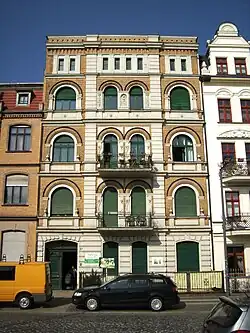 Mietwohnhaus. 1896 (BE), Bauherr war der Kaufmann Albert Blume. Die Ausführung erfolgte durch den Bauunternehmer Fr. Hausten. Langjähriger späterer Eigentümer war der Fabrikdirektor Kallosche. In der Blockrandbebauung eingebundene Fassade mit risalitartig ausgebildeter Loggienachse. Rustiziertes Erdgeschoss mit einer Einfahrt. Vertikale Betonung der Obergeschosse durch geschossübergreifende Lisenen, welche die Fensterachsen paarweise zusammenfassen. In der Verbindung von Sturz- und Brüstungszonen setzen die Fensterachsen zusätzliche Akzente. Der Bauschmuck ist außergewöhnlich plastisch. Bemerkenswert ist die durch Helm und Eule gekennzeichnete Darstellung der Minerva oberhalb der Loggia, Göttin des Handwerkers, Künstlers und Lehrers. Hier bestehen Bezüge zur Inschrift „Kunst und Lehre bringt Gunst und Ehre“ oberhalb der Fenster des ersten Obergeschosses. Das Innere ist mit Stuckdecken, Supraportendekor und bauzeitlichem Tür- und Fensterbestand noch umfänglich von Originalsubstanz geprägt. Im aufwändigen, ungewöhnlich plastischen Dekor verbinden sich konventionelle und individuell gestaltete Motive. Der Stuck wurde teils vor Ort ausgeformt, die Minerva hatte ursprünglich gläserne Augen. Ein interessantes Beispiel einer Umbruchphase, in der sich der Späthistorismus vom historischen Formenkanon löst und nach neuen gestalterischen Lösungen sucht. Originell in dem programmatischen Stuckdekor, der in seiner Plastizität teils den Charakter von Bauskulptur bekommt. In dem dahinter stehenden Gestaltungsanspruch ist das Haus von baugeschichtlicher und künstlerischer Bedeutung.