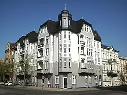 Villenartiges Wohnhaus. 1895 (BE) für den Rentier Heinrich Starcke erbaut, die Ausführung erfolgte durch das Bauunternehmen des Architekten und späteren Stadtrats Ewald Schulz. Zweigeschossiges Gebäude mit Mansardterrassendach. Das Grundstück mit bauzeitlichen Lanzetteneinfriedung. An der freistehenden Seite befindet sich ein Treppenturm mit Eingang und Einfahrt zum ehemaligen Remisen- und Stallgebäude. Die Frontseite ist durch einen Mittelrisalit mit Zwerchgiebelabschluss symmetrisch eingegliedert. Die Putzquaderung ist im Erdgeschoss und an den Kanten des Obergeschosses, hier die Fenster durch Segmentbogenverdachungen, Brüstungs- und Sturzdekor akzentuiert. Der Dachwalm hat einen Ziergitterabschluss und bauzeitlichen Dachhäuschen mit Kugelaufsätzen, der Turm besitzt eine Dachhaube. Das repräsentative Innere ist mit Stuckdecken, bemalten Holzdecken und dem bauzeitlichen Tür- und Fensterbestand noch umfänglich von Originalsubstanz geprägt. In den gerundeten Fensterformen, aber auch im verspielten Neurokokodekor mit Muschel- und Bandwerk zeigt sich eine in den letzten Jahren des Späthistorismus verbreitete Tendenz zu bewegten, kleinteiligen Formen. Ein qualitätsvolles, gut erhaltenes villenartiges Wohnhaus, das mit seiner Einfahrt für Kutschen und der Ausstattung auf gehobenen Lebensstil verweist. Von baugeschichtlicher Bedeutung als repräsentative Wohnhausarchitektur, vom Typus einer Stadtvilla.