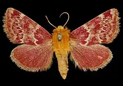 Die Falter erreichen eine Flügelspannweite von 20 bis 22 Millimetern.[1] Zwischen den Geschlechtern besteht farblich nur ein geringer Unterschied. Die Grundfarbe der Vorderflügeloberseite variiert bei beiden Geschlechtern von Rubinrot bis zu Rostrot. Die innere sowie die äußere Querlinie haben eine weiße oder hellgelbe Farbe und sind stark gezackt. In der Diskalregion heben sich zuweilen einige gelbliche Einmischungen ab. Die Wellenlinie ist weißlich oder gelblich und meist undeutlich ausgebildet. Ring- und Nierenmakel sind nicht erkennbar oder nur angedeutet. Die Hinterflügeloberseite der Männchen ist einfarbig rötlich, bei den Weibchen dunkelbraun bis dunkel rotbraun. Der Thorax ist schopfartig kräftig gelb behaart.