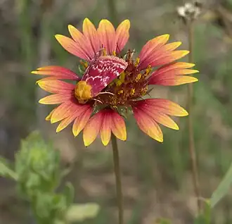 Schinia volupia auf einer Blüte von Gaillardia pulchella | ||||||||||||