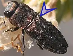 Die Flügeldecken sind an den Schultern am breitesten. Die Schulter ist etwas erhaben (Pfeilspitze in Abb. 4). Seitlich sind die Flügeldecken hinter den Schultern etwas niedergedrückt. Dahinter sind sie so verengt, dass von oben betrachtet die Seiten des Hinterleibs sichtbar sind. Die Flügeldecken enden einzeln leicht zugespitzt verrundet. Die Flügeldecken sind neben der Naht sehr flach niedergedrückt. Sie sind sehr fein und gleichmäßig granuliert, es sind keine Streifen oder Punktreihen ausgebildet. Sie sind unscheinbar spärlich und fein kurz weiß behaart. Der Seitenrand der Flügeldecken ist nahe der Spitze sehr fein zähnchenartig gekerbt.