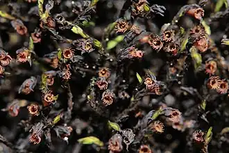 Die mittelgroßen bis großen, bis 11,5 Zentimeter langen Pflanzen sind drahtartig starr, niederliegend und an den Spitzen aufsteigend. Sie bilden schwarze, nur an schattigen Stellen oben auch bräunliche Rasen. Ein Zentralstrang im Stämmchenquerschnitt fehlt. Die eiförmig-lanzettlichen Blätter sind scharf gekielt, eine Glasspitze fehlt oder ist nur sehr kurz. Die Blattränder sind oben unregelmäßig gezähnt. Die Lamina ist einzellschichtig.