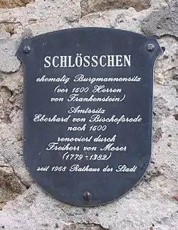 - ↑ Die Baubeschreibung orientiert sich weitgehend an: Landesamt für Denkmalpflege Hessen (Hrsg.): Schlösschen, Rathaus, Untergasse 16 In: DenkXweb, Online-Ausgabe von Kulturdenkmäler in Hessen.