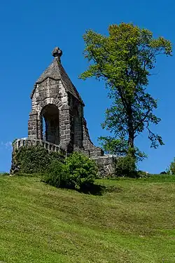 Als Folge der 600-Jahr-Feier der Eidgenossenschaft 1891 kam die Idee auf, ein Schlachtdenkmal zu errichten. Es sollte dort stehen, wo die Schlacht stattgefunden hatte. In den Chroniken gab es dazu verschiedene Angaben, und auf Karten wurde die Bezeichnung Morgarten für unterschiedliche Orte verwendet. Sowohl der Kanton Zug als auch der Kanton Schwyz beanspruchten den Schlachtort für sich. Mit Unterstützung der Schweizerischen Offiziersgesellschaft verfolgte auf Zuger Seite der Arzt und Tourismuspromotor Josef Hürlimann aus Unterägeri Pläne für ein Denkmal im Buechwäldli am Ufer des Ägerisees.[14] Dieser Standort lag im Dorf Hauptsee, welches 1905 in Morgarten umbenannt wurde. 1906 wurde der Bau des vom Architekten Robert Rittmeyer entworfenen Schlachtdenkmals begonnen. Eingeweiht wurde es am 2. August 1908. Die Schwyzer Regierung war weiterhin davon überzeugt, dass der Schlachtort in der Nähe der Schlachtkapelle lag. Sie weigerte sich, eine offizielle Delegation an die Eröffnungsfeier zu schicken.