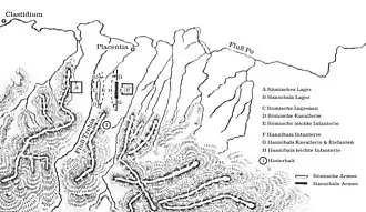 Der Konsul hatte in der Nähe der Festung Placentia Stellung genommen, musste diese aber, nachdem gallische Verbände gesichtet worden waren, verlassen und setzte sich auf den Hügeln hinter der Trebia fest. Die karthagische Vorhut, die überwiegend aus numidischen Reitern bestand, fand nur noch das verlassene Lager vor und verschwendete dabei Zeit mit der Plünderung, anstatt die Verfolgung der Römer aufzunehmen.
