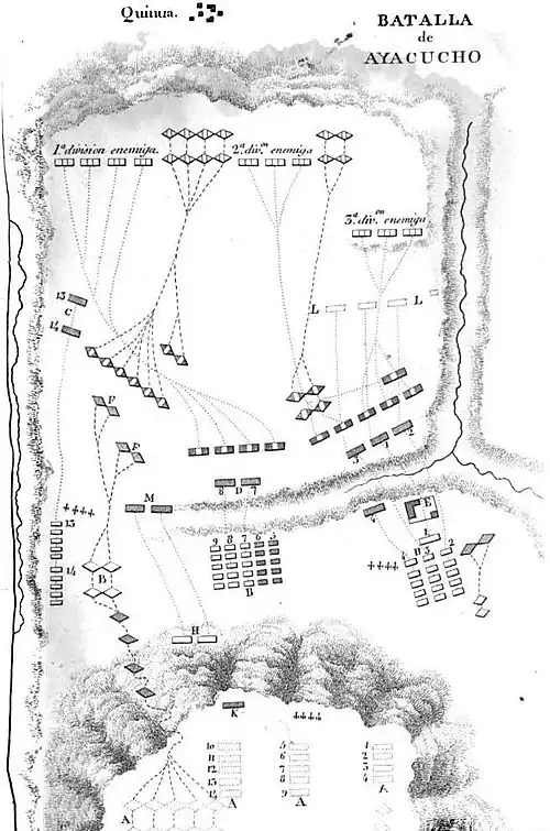 Sucre blieb keine Wahl als seinen Marsch fortzusetzen, und auch ein Nachtmarsch konnte die hartnäckigen Verfolger nicht abschütteln. Am 6. Dezember erreichte er den Weiler Quinua, gut zehn Kilometer Luftlinie östlich von Huamanga, wo er sein Heer rasten ließ.[13] De la Serna war ihm weiter westlich gefolgt, hatte Huamanga vorsorglich besetzen lassen und war weiter nach Norden vorgestoßen. Am folgenden Tag bog er nach Südosten um und erreichte den Berg Condorcunca, an dessen Hängen er seine Soldaten eine befestigte Stellung errichten ließ.