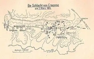 - ↑ Die Strecke von Cerny nach Festieux über Martigny auf den alten Wegen (nicht über die neue D967) beträgt genau 14 km; von Festieux sind es noch 12,5 km bis zum alten Craonne des Jahres 1814. Diese Zahlen legen nahe, dass Blüchers Plan, der wahrscheinlich von Gneisenau stammte, durchaus sinnvoll und durchführbar gewesen ist.