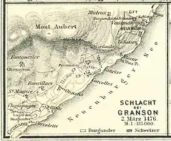 Während Karl bei Grandson über zehn Tage mit der Belagerung verlor, konnten sich bis am 1. März um Bevaix südwestlich von Neuenburg sämtliche eidgenössischen Truppen mit Zuzug aus den verbündeten Städten Freiburg i. Ü., Biel, Solothurn, St. Gallen und Schaffhausen sowie der Niederen Vereinigung, Basel und den österreichischen Vorlanden mit den Bernern in Ruhe versammeln. Insgesamt soll das eidgenössische Heer ca. 18'000 Mann gezählt haben, hauptsächlich Infanterie mit einem kleinen Kontingent Kavallerie aus den österreichischen Vorlanden und der Niederen Vereinigung. Als Karl vom eidgenössischen Anmarsch erfuhr, liess er an den zwei von Neuenburg nach Grandson führenden Wegen vorausgeschobene Posten einrichten, in der Burg Vaumarcus und an der Rivière de la Vaux. Die Eidgenossen versuchten darauf, Karl aus seiner guten Position in seinem befestigten Lager zu locken, indem sie in der Nacht vom 1. auf den 2. März die Burg Vaumarcus angriffen. Obwohl der Handstreich misslang, liess sich Karl provozieren und verliess am 2. März seine überlegene Position. Diese Entscheidung ist aus heutiger Sicht schwer verständlich und kann nur mit Karls Unterschätzung des Gegners bzw. seiner Ungeduld erklärt werden.[4] Herzog Karl griff die Eidgenossen jedoch nicht direkt an, sondern befahl seinem Heer lediglich bis Concise vorzurücken, wo auf freiem Feld und ohne Artilleriebedeckung auf seine Anweisung ein Lager bezogen werden sollte. Am gleichen Tag stiessen an zwei Orten eidgenössische Abteilungen in Richtung Grandson vor. Einerseits oberhalb des Sees, wo rund 2500 Schwyzer, Thuner, Bieler, Zürcher, Luzerner und St. Galler die burgundischen Posten an der Rivière de la Vaux alarmierten, andererseits entlang des Sees, wo die Burg Vaumarcus eingeschlossen wurde. Auf die Nachricht, dass die oberhalb vorstossenden Truppen auf den Feind gestossen seien, vereinigten sich die beiden Kontingente bis auf eine zur Belagerung der Burg zurückbleibende Truppe aus dem Simmental.