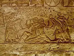 Zwei gefangene hethitische Späher machten unter Zwang falsche Angaben zu den feindlichen Stellungen (Relief im großen Tempel von Abu Simbel)