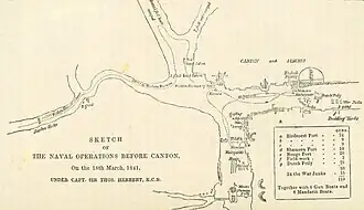 ![]() Zeitgenössische britische Skizze der Flottenoperationen vor Guangzhou (Kanton) am 18. März 1841, Erstveröffentlichung 1845 | |||||||||||||||||