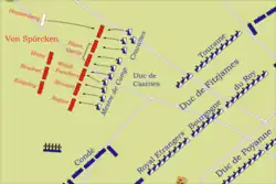 - ↑ Die Brigade du Roy desselben Treffens hielt der Marquis de Contades zurück, um damit den Angriff zweier Infanterie-Brigaden bei Malbergen zu unterstützen, siehe unten.