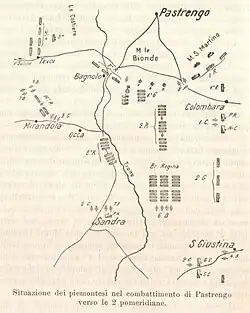 Am Morgen des 30. April marschierten die Piemonteser auf den Höhen von San Giustina und in ihrem Lager bei Sandra zum Angriff auf. Gegenüber hatten sich die österreichischen Brigaden Wohlgemuth und Erzherzog Sigismund vom rechten Etsch-Ufer ausgehend über den Monte San Martino, den Monte le Bionde und die Höhen von Piovezzan bis Ronchi halbkreisförmig aufgestellt. Generalleutnant de Sonnaz hatte sein 2. Korps in drei Angriffskolonnen formiert, die alle konzentrisch auf Pastrengo vorrücken sollten: