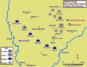 Der Vizekönig Eugène richtete die Stadt Sacile zur Verteidigung ein. Er wollte hier die Österreicher durch einen Angriff zum Stehen bringen. Am Morgen des 16. April schickte Eugène seinen starken rechten Flügel bei Brugnera gegen Pordenone vor. Der Vizekönig wollte wieder über die Livenza vorrücken und sofort den Gegenangriff einleiten, obgleich die Reiterei noch nicht verfügbar war. Der rechte Flügel, die Divisionen Seras und Severoli, rückten von Brugnera nach Tomai vor. Im Zentrum der Schlachtfront besetzten die Division Grenier den Höhenzug von Fontana Fredda bis gegen Vigonovo, dahinter diente die Division Barbou als Reserve. Der linke Flügel jenseits von Vigonovo stehend, wurde von der in drei Treffen aufmarschierenden Division Broussier gebildet. Die österreichische Division unter FML Frimont, der am linken Flügel die Vorhut des VIII. Korps (FML Albert Gyulay) führte, drang dreimal in das Dorf Porzia ein, dreimal wurde sie wieder hinausgeworfen. Zwei rechts von Porzia aufgefahrene österreichische Batterien fügten der angreifenden gegnerischen Reiterei schwere Verluste zu. Die Brigade des Generals Gajoli griff gegen das Dorf Vigonovo an, bis das IX. Korps, das noch über Nouoredo und die Campagna di Vigonovo vorging, eingetroffen war. Bis Mittag hielt Johann seinen rechten Flügel noch defensiv, dann entschloss er sich endlich, den linken Flügel bei Porzia zu entlasten, indem er die Brigade des Oberst Volkmann mit drei Bataillonen über Ronche auf Villadolt angreifen ließ. Es war die Schlacht bereits entschieden, dann begann der zusätzliche Angriff des vor Vigonovo eingetroffenen IX. Korps (FML Ignac Gyulay). In schweren Kämpfen wurden die Franzosen bis zum Abend nach Sacile zurückgeworfen.[1] Die neu konstruierte Brücke über die Livenza war der Brennpunkt der Schlacht. Auf französischer Seite wurde General Broussier, auf österreichischer General Colloredo-Mansfeld lobend erwähnt.